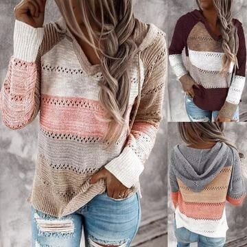 Women's Striped Color Block Hoodie Sweater Long Sleeve V Neck Casual Hollow Out Knit Pullover Tops
